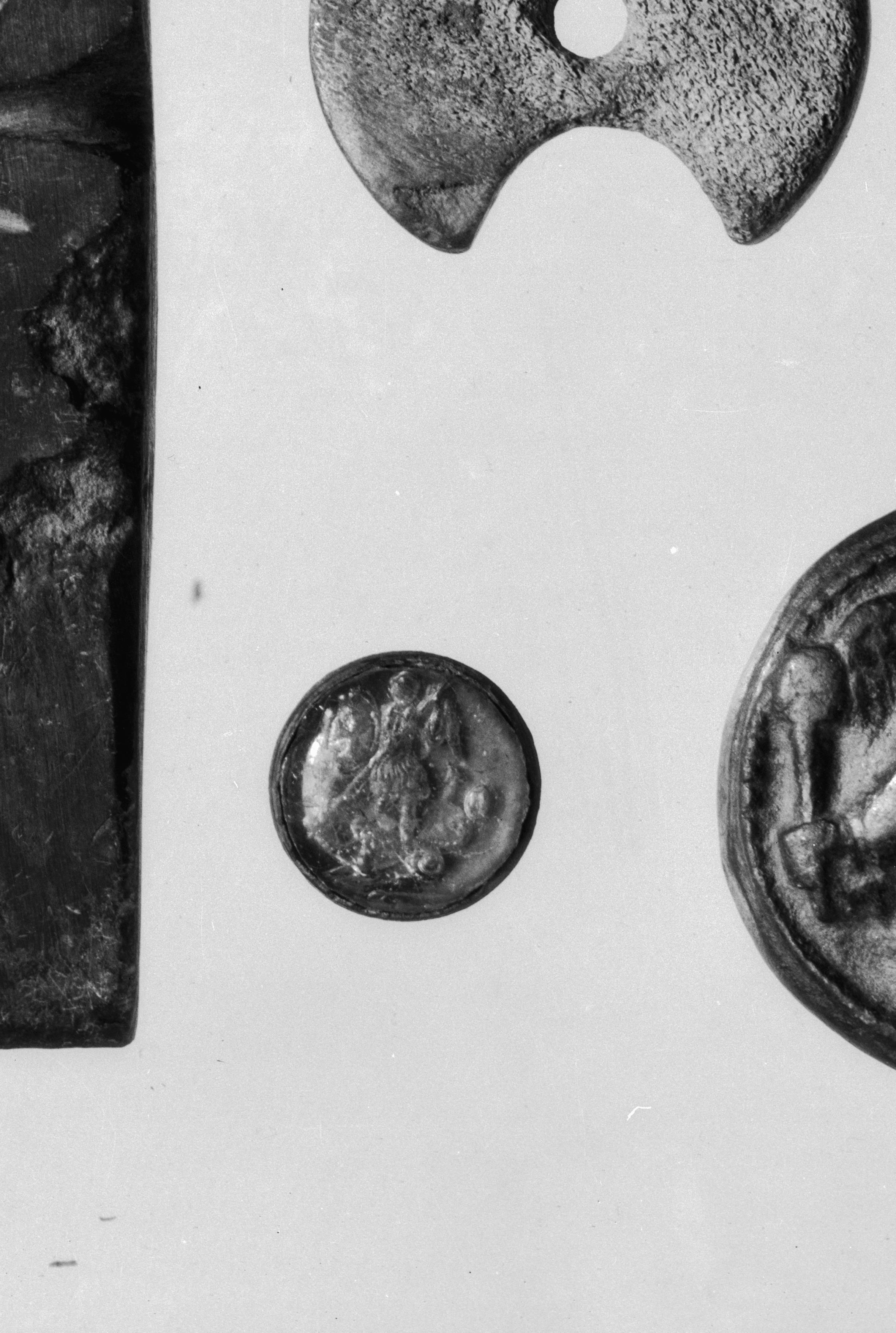 Knapp, brons, med bild föreställande Sankt Mikael och draken.