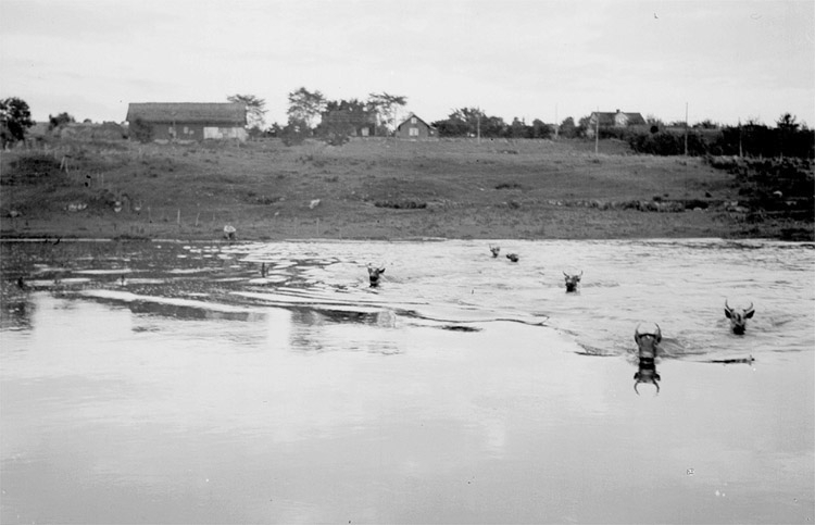 Sommarflöde i Hornborgaån. Simmande kor.