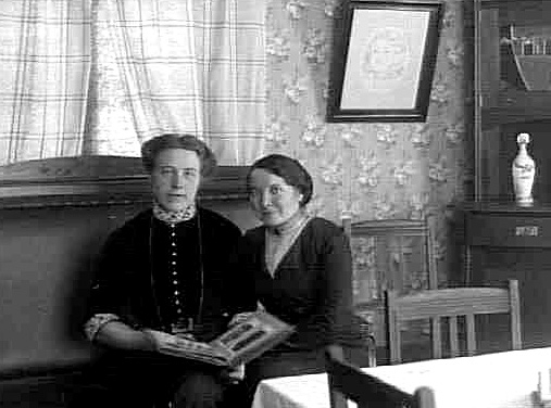TVÅ KVINNOR TITTANDE I FOTOGRAFIALBUM.