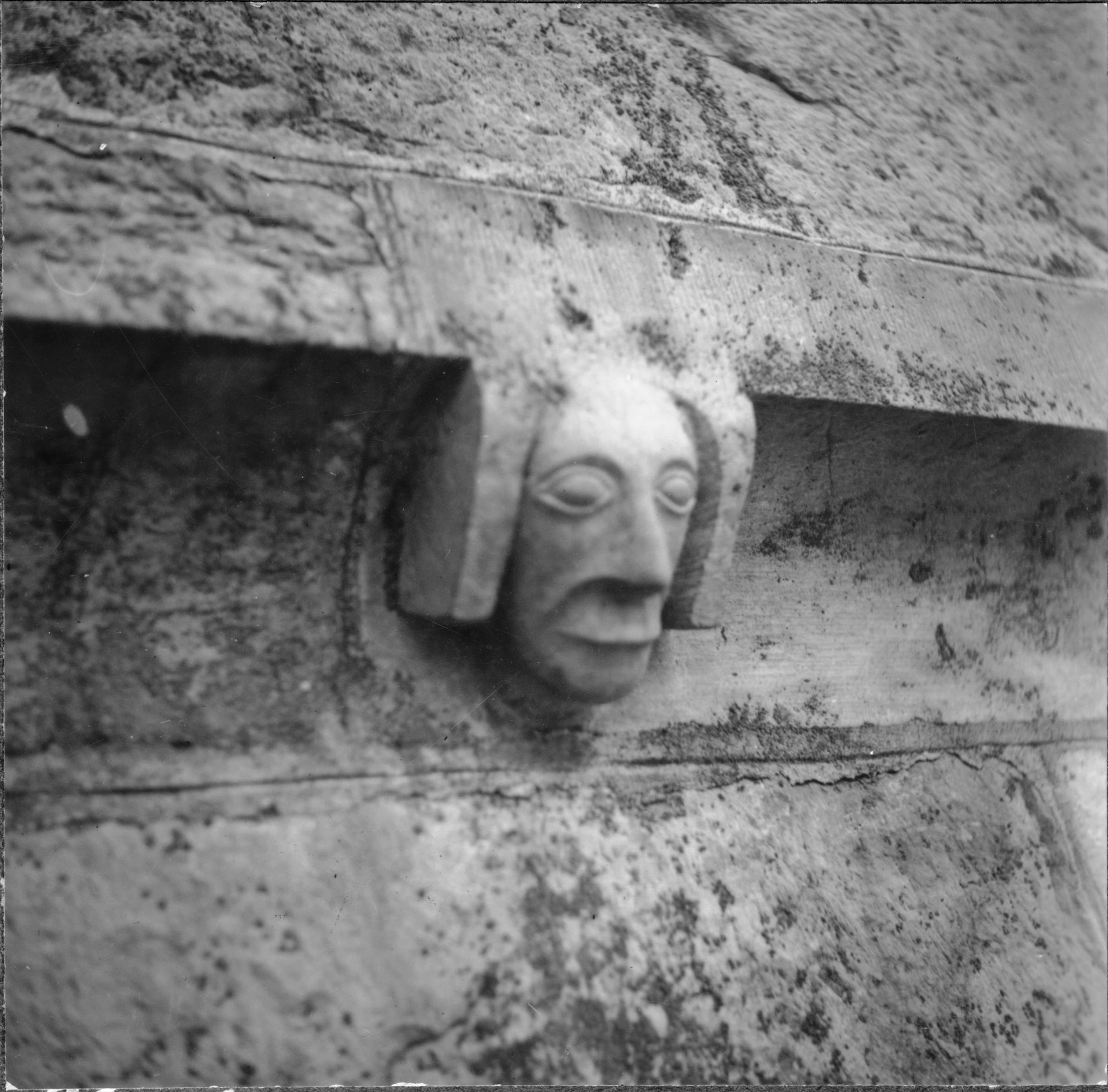 Skulpterat huvud, nummer ett av fyra, under stora övre fönstret på västfasaden. Fotograferat när fönsterrutorna byttes efter branden 1936.