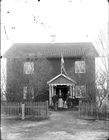 Fyra vuxna, tre barn framför smalt och högt hus.