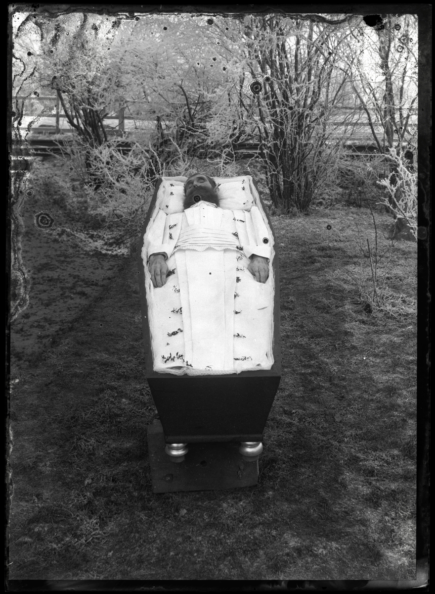 Man i öppen likkista