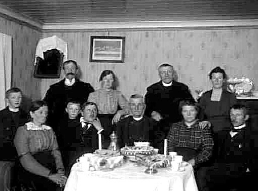 FAMILJ SAMLAD VID ETT DUKAT KAFFEBORD.