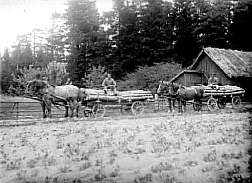 TRANSPORT AV TIMMER MED TVÅ HÄSTANSPÄNDA ARBETSVAGNAR.