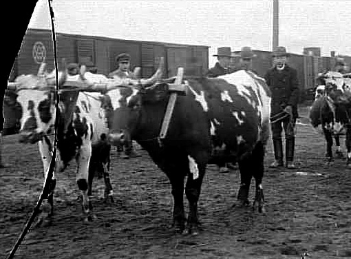 MAN SOM KÖR ETT PAR OXAR, GODSVAGNAR I BAKGRUNDEN .