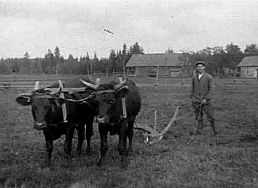 EN BONDE PÅ ÅKERN PLÖJER MED SINA BÅDA OXAR.