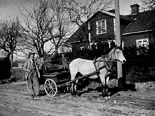 TVÅ MÄN STÅR VID EN LITEN HÄSTVAGN ANSPÄND MED EN HÄST