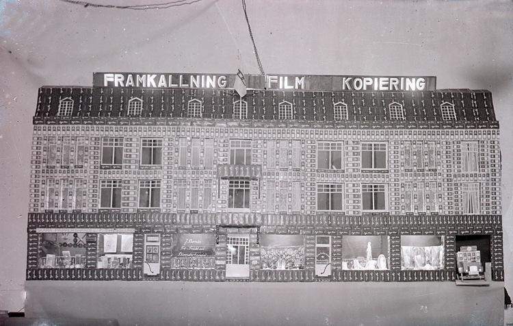 Modell av fastigheten Marumsgatan 4 uppbyggd av filmrullar.