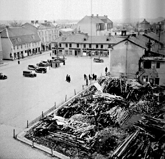 Utsikt från övre stora fönstret på Domkyrkans västra fasad över "Brända tomten" och Stora Torget.