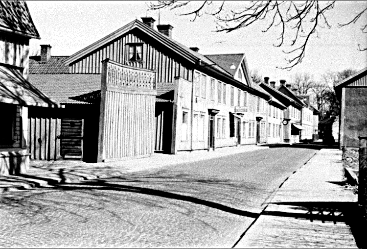 Huset längst t.v. (med markis) är Skolgatan 9. Uthuset tillhör Jupiter 14, Skolgatan 11. Därefter syns Skolgatan 13-15, 17, 19 och 21.