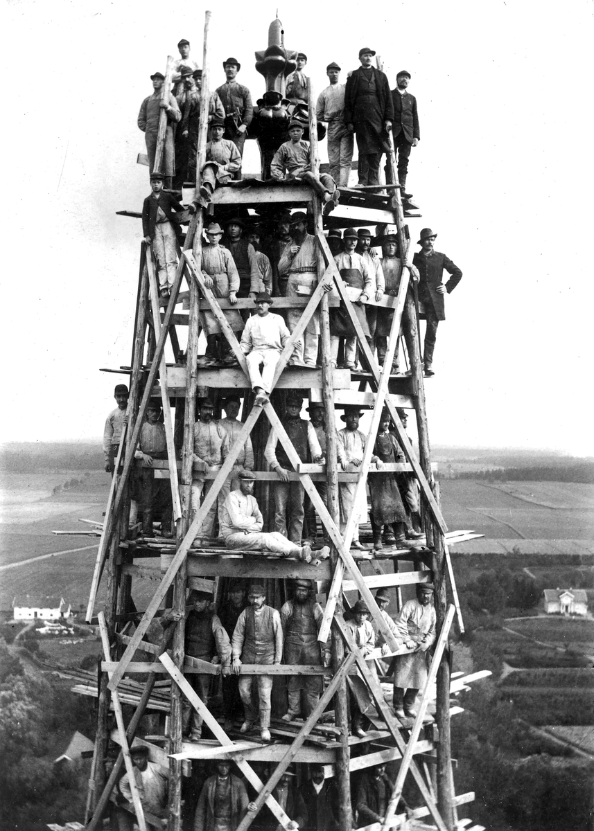 Arbetare står på byggnadsställning i Domkyrkans ena torn