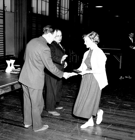 Skara. Bordtennis; DM i Läroverkets gymnastiksal 27/3 1955, prisutdelning.