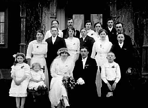 BRÖLLOPSPAR MED EN GRUPP GÄSTER OMKRING SIG.