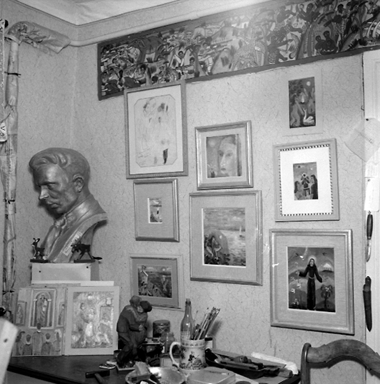 Interiör hos konstnär Frans Larsson i Bladska huset, Skara, 1958.
