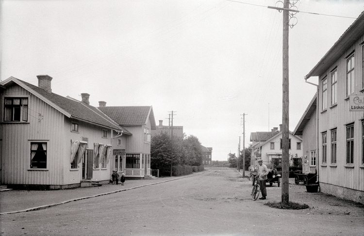 I huset till vänster: Bageri och Frisör.