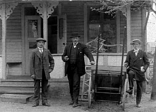 TRE MÄN STÅENDE OMKRING EN DRAGKÄRRA