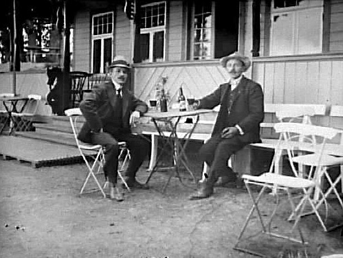 TVÅ MÄN DRICKER ÖL FRAMFÖR SERVERINGSLOKAL ERIK RUD MED SVÅGER.