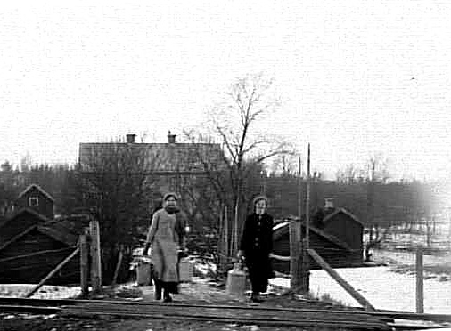 TVÅ UNGA KVINNOR MED MJÖLKKANNOR VID ETT JÄRNVÄGSSPÅR.