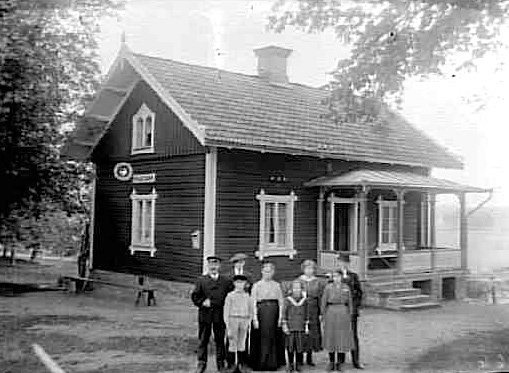 Sluss- o brovakt Gustav Larsson med hustru Maria och barnen Arvid, Olga, Gerd och Signe framför sin bostad 1916.