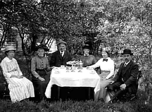 MÄN OCH KVINNOR DRICKER KAFFE I TRÄDGÅRDEN.