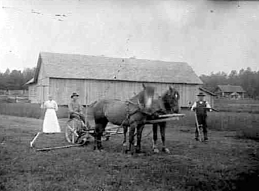 TVÅ MÄN OCH EN KVINNA VID EN SLÅTTERMASKIN SOM ÄR ANSPÄND MED TVÅ HÄSTAR. 1919-07.