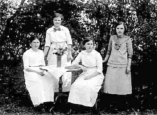 FYRA KVINNOR VID ETT BORD I TRÄDGÅRDEN.