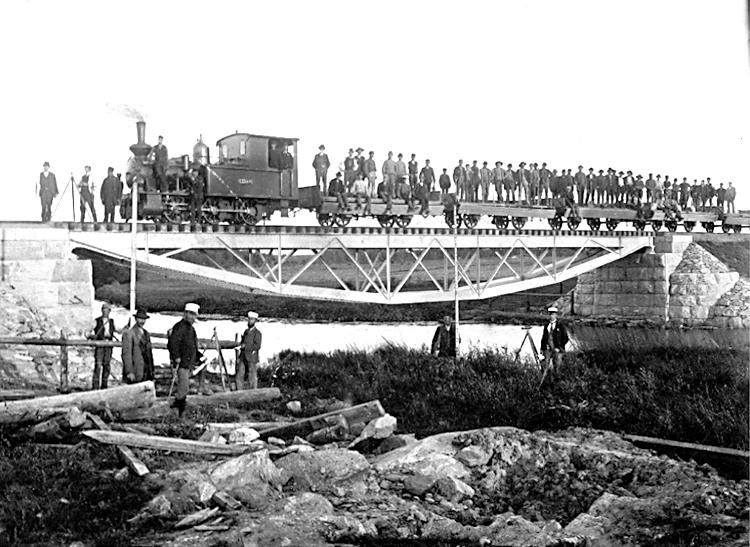 "Fotot visar hur man vid banbygget år 1899 "provtrycker" bron över Flian vid Kålltorp.