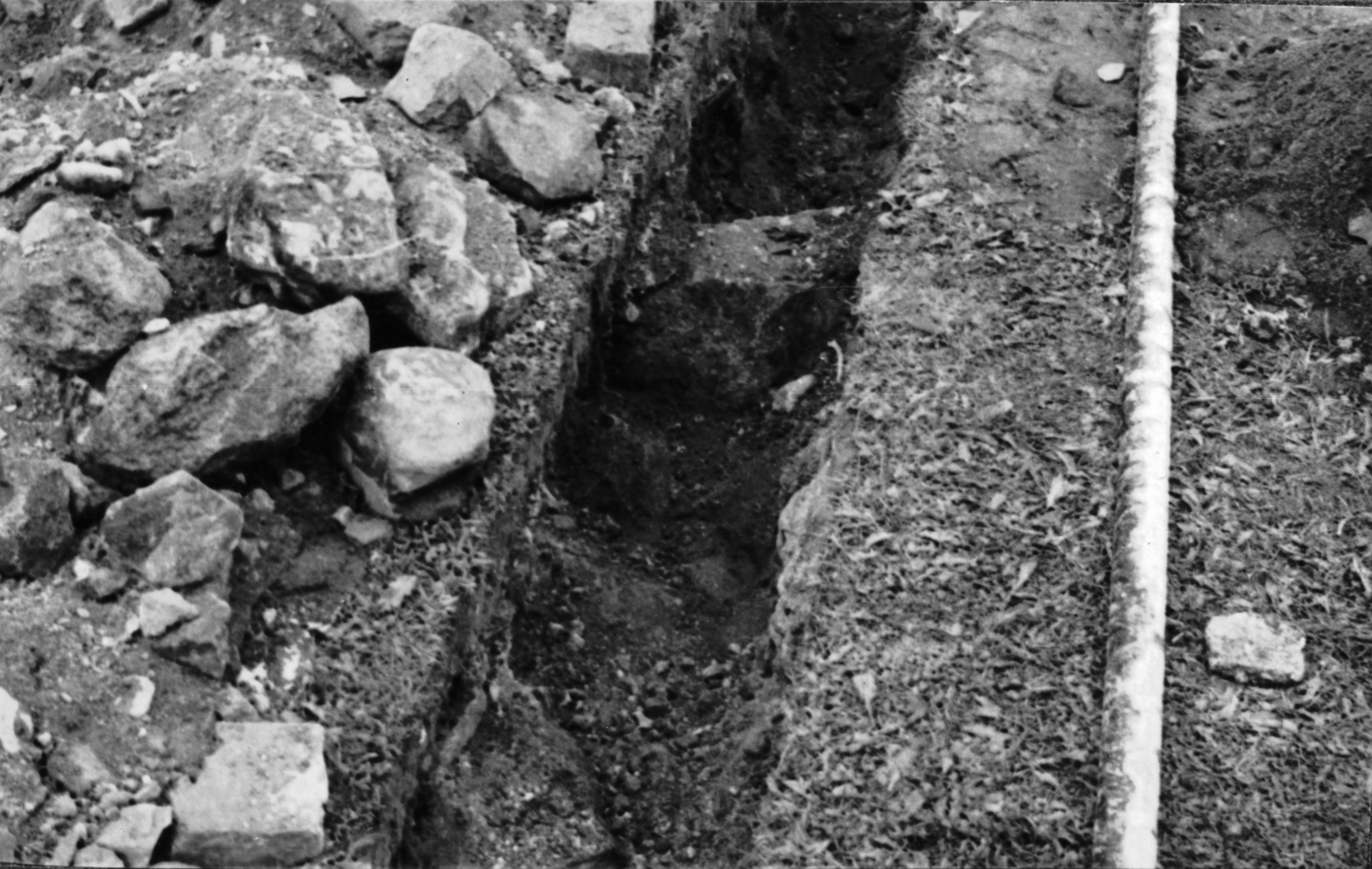 Rester av klosterkyrkan. Västra längans östra mur blottad av kabelgrop. Mot sydöst.