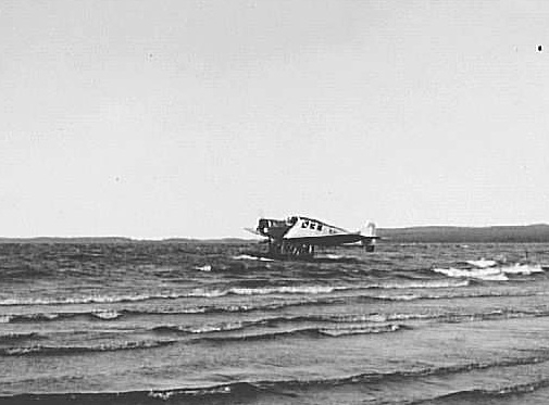 Ett flygplan från Ahrenbergs Flyg landar på sjön Örlen vid Fagersanna.