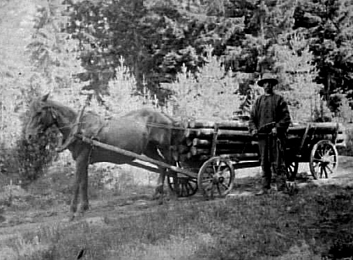 EN MAN SOM KÖR EN HÄST ANSPÄND FRAMFÖR EN VAGN LASTAD MED TIMMERSTOCKAR.