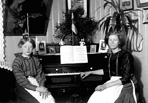 TVÅ KVINNOR SITTANDE VID ETT PIANO.