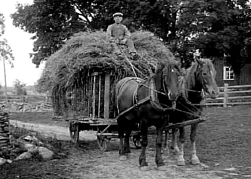 Hölass, lastat på en vagn med vadsbokrage o anspänt med parhästar.