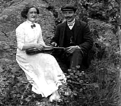 ETT PAR SITTER VID ETT BERG, HON SPELAR FIOL.
