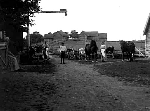 GÅRDSPLAN MED HÄSTAR,KOR OCH NÅGRA PERSONER.