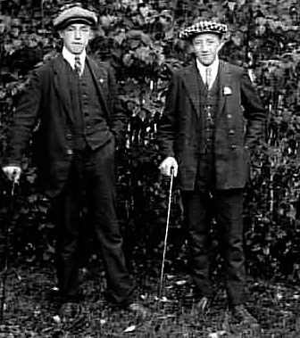 TVÅ MÄN STÅENDE UTOMHUS I HELGDAGSKLÄDER.