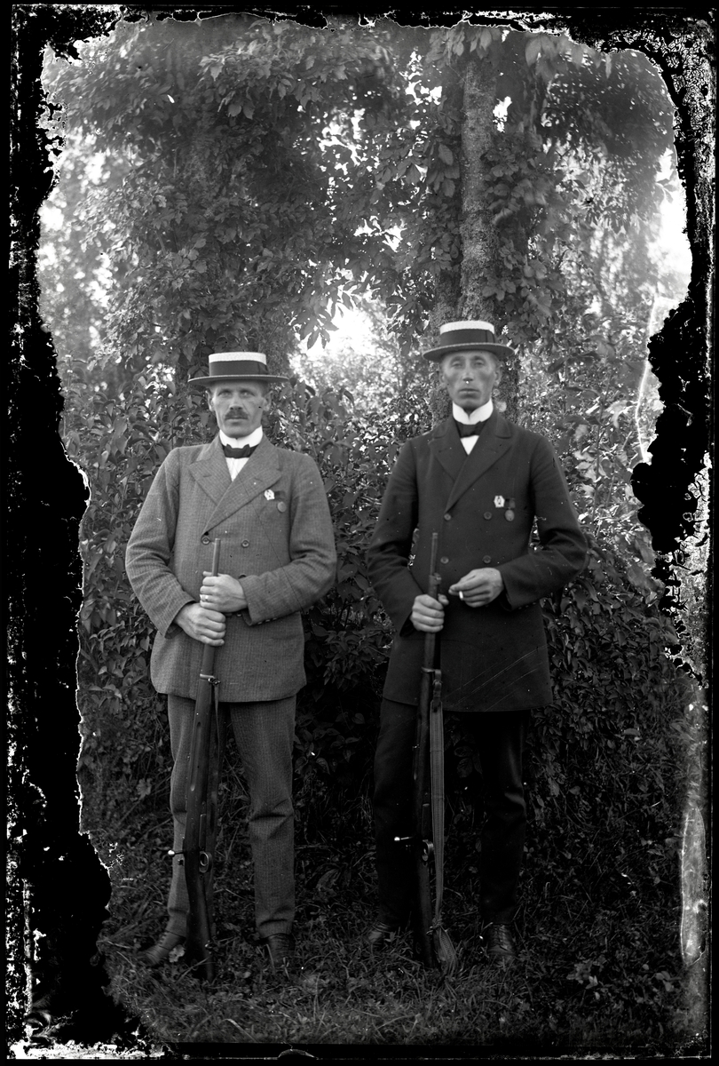 Två män med gevär och skyttemedaljer