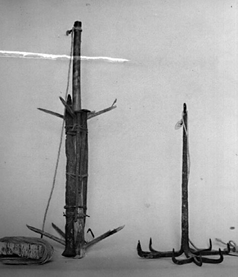 2001-01-30, AS. Såtekrok, redskap som användes vid fiske av Lake. Man agnade krokarna med något ljust föremål (vit tygbit el. dyl.) som sedan Laken högg i.
