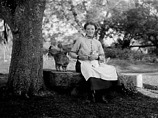 EN KVINNA SITTER PÅ EN STEN TILLSAMMANS MED TRE KATTER.