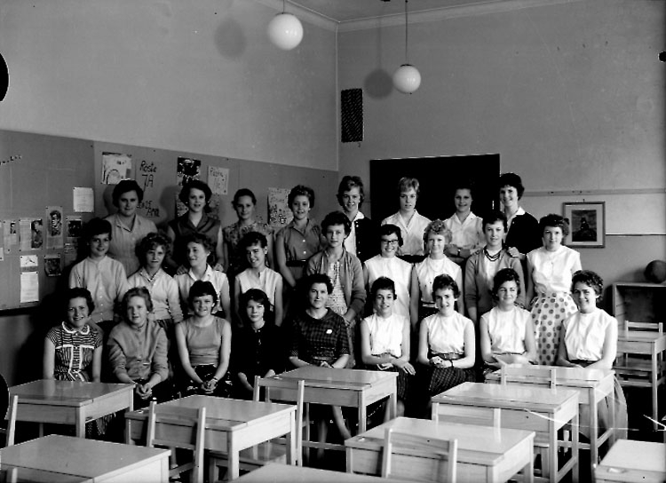 Klassrumsinteriör, 25 flickor med lärarinna.