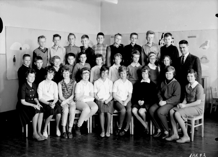 Olaus Petriskolan, klassrumsinteriör, 28 skolbarn med lärare Jan Axelsson.
