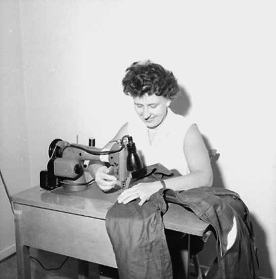 Titel: Interiör, en kvinna vid symaskinen. "Ulla lagar blåställ". Beställare: Sedells Reklam.