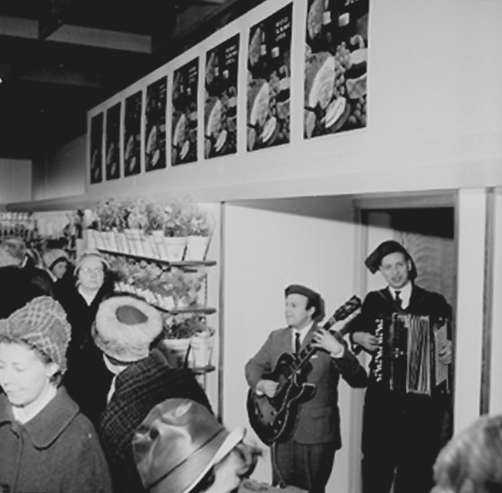Titel: Konsumhallen i Laxå, affärsinteriör, kunder och personal.