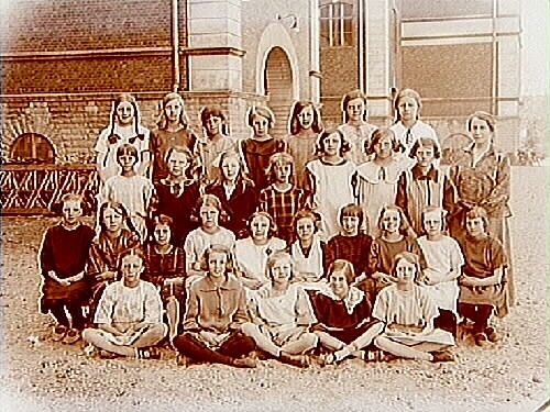Norra Folkskolan, 29 skolflickor med lärare, sal 21. Skolbyggnad i bakgrunden.