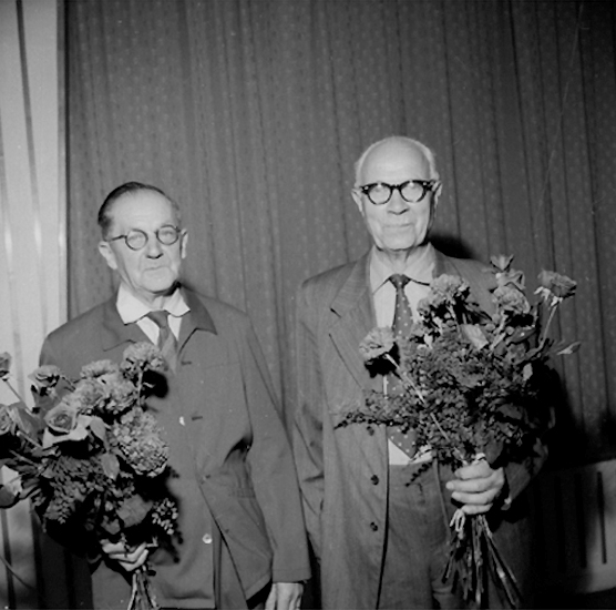 Rumsinteriör, två män, Oscarias pensionärer. Avtackning.