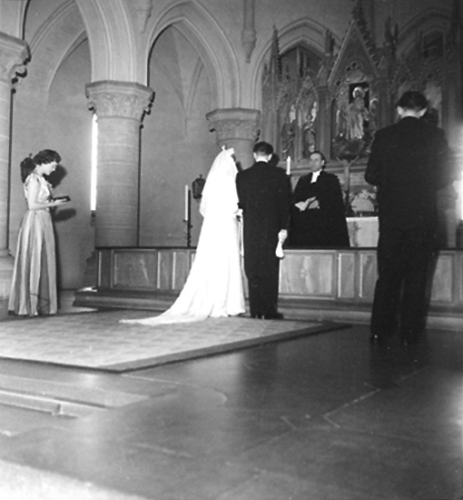 Kyrkointeriör, bröllop, brudpar, bröllopsgäster och en präst.