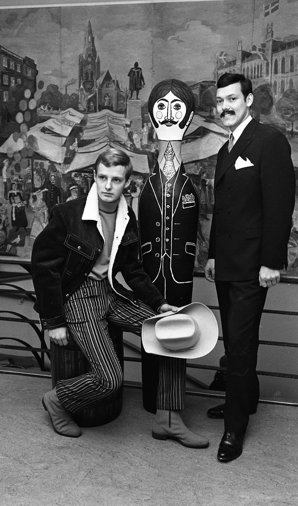 Framför en tavla föreställande Hindersmässan på Stortorget står två män. En man i kostym och skjorta,