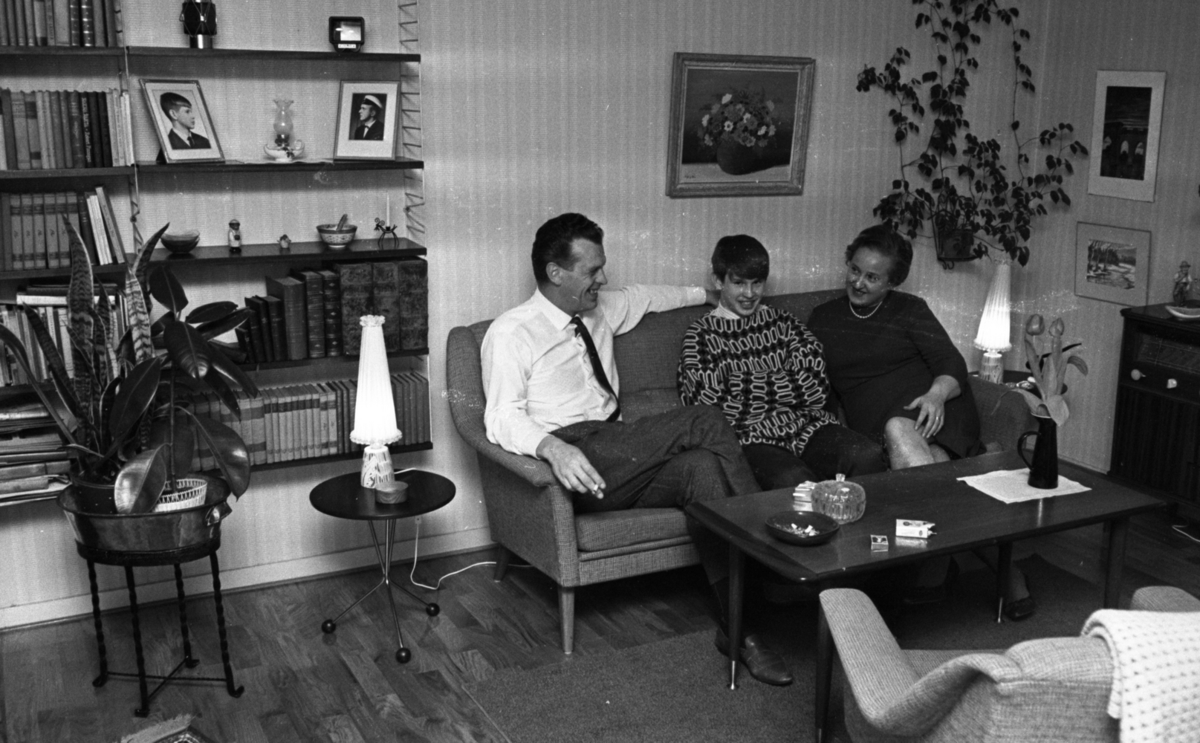 En familj bestående av en far, en mor och deras unge tonårsson sitter i en soffa i ett vardagsrum. På väggarna hänger tavlor. En bokhylla syns till vänster. Framför familjen i soffan står ett bord.