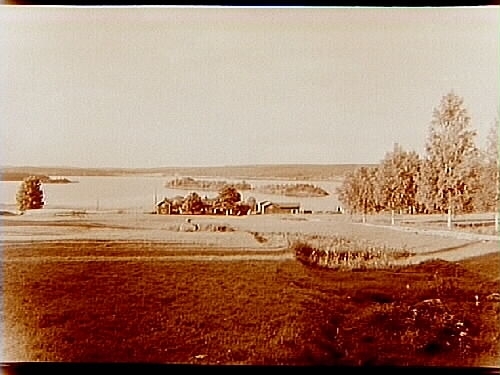 Sjöutsikt. Två bostadshus och en ekonomibyggnad.