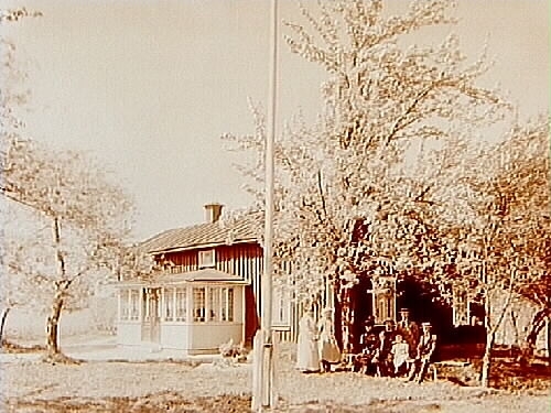 Titel: En och en halvvånings bostadshus med glasad veranda. 7 personer framför huset. Karl Johansson
