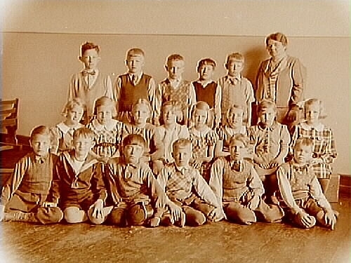 Olaus Petriskolan, klassrumsinteriör, 19 skolbarn med lärarinna fröken Elisabeth Grahn, sal 4.